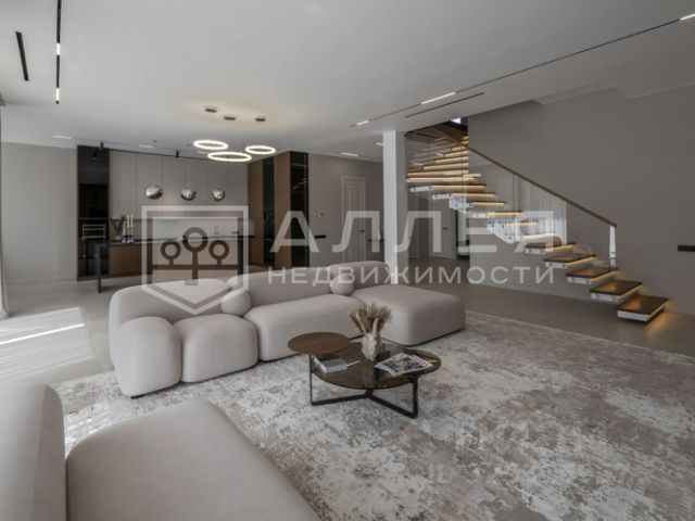 В отделке используются только премиальные материалы: мрамор (отделка камина, раковина в гостевом с/у, хаммам, прихожая, мужская мастер-ванная), кварцит (женская мастер-ванная, остров на кухне), инженерная доска из дуба (на полу), тик (потолок бассейна), кедр и абаш (сауна).