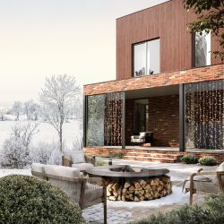 Дом для отдыха оборудован модульным барбекю-комплексом, установлена параллельно-сдвижная система остекления с выходом к декоративному водоему.
