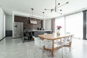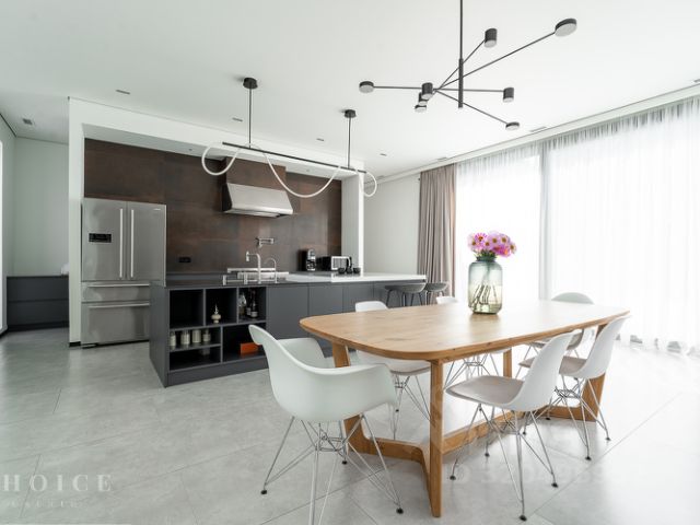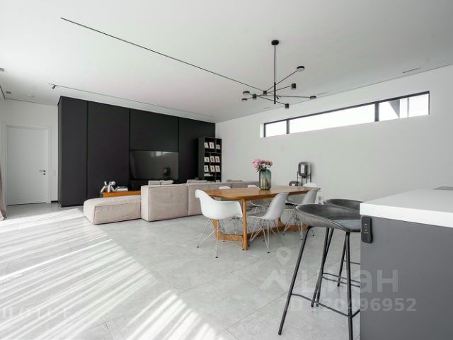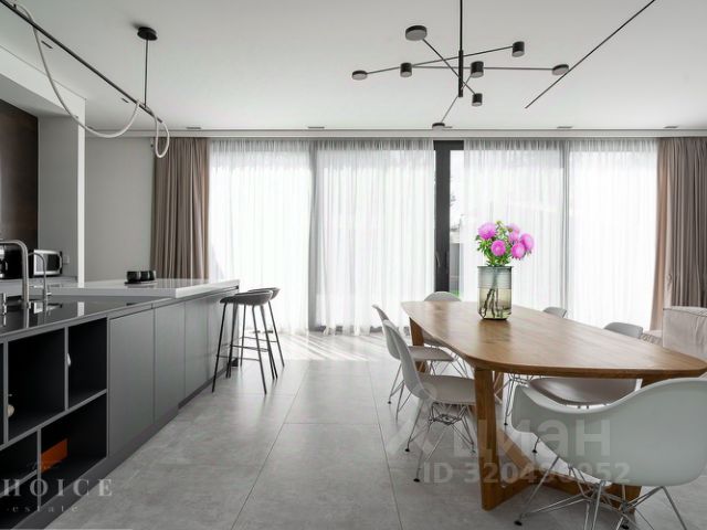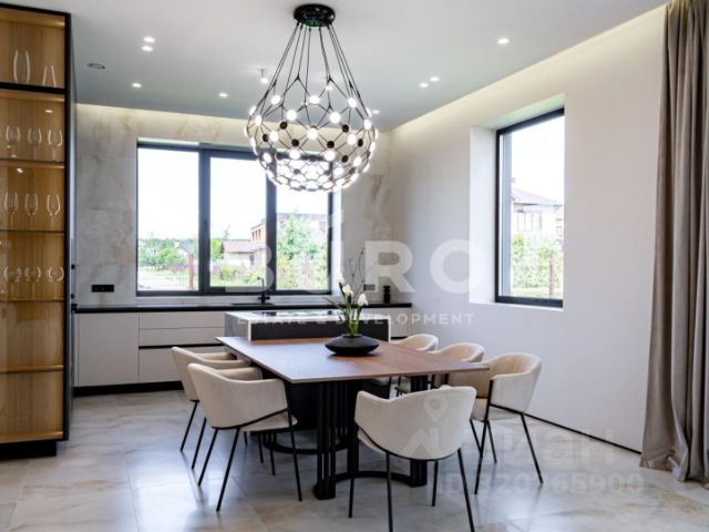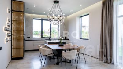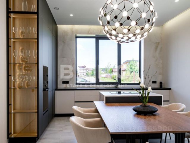 Дом полностью мебелирован, ТВ самсунг. Установлены угловая кухня HECKER (Германия), со встраиваемой техникой: холодильник и морозилка Либхер, духовой шкаф, микроволновая печь, варочный индукционная панель, посудомоечная машины, винный шкаф фирмы Сименс. На полу керамогранит, инженерная доска (американский