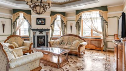 На полу в гостиной уложен художественный паркет из экзотических пород древесины, таких как дуссие, томинтоза, граб, кемпас. Также художественный паркет уложен на полах хозяйской спальни и кабинета.