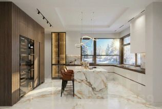 Входная группа открывает пространство первого этажа: две гардеробные с мебелью Porada и Frato, холл и объединённая зона гостиная - кухня - столовая с панорамными видами на участок. Гостиная со вторым светом и потолками почти 10 метров, камином и видом на парк. Центральная стена оформлена итальянским мрамором в раскладке "бабочка", создающей скульптурный эффект. В интерьере - диван Budapest и консоль Guell от Baxter, журнальный стол Minotti Song, аксессуары Bosa, предметы Ulivi и Smania. Обеденная зона - стол Minotti Linha на 12 персон, светильники HENGE и Terzani. Кухня - Siematic, с техникой GAGGENAU, оформлена лаконично и функционально. Также на этаже: кабинет с библиотекой (Emmemobili, Rugiano), гостевая спальня с ванной и гардеробной (Porada, Rugiano), две гостевые ванные комнаты и полноценный SPA-комплекс с бассейном, сауной, хаммамом и тропическим душем. Оконные системы SCHUCCO и двери RIMADESIO задают архитектурную точность, а стеклянный лифт добавляет драматургии пространству.