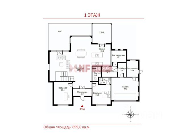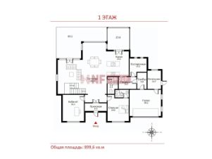 1й этаж: гостиная с камином и вторым светом, кухнястоловая с выходом на террасу, холл, кабинет, гостевая спальня с санузлом, прихожая с гардеробной, зона прислуги (постирочная, гардероб, котельная с отдельным входом), гараж на 2 машиноместа. Выходы на открытую террасу из гостиной и столовой.