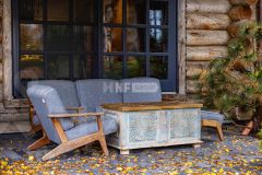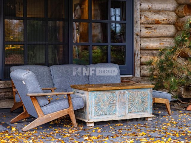 На участке установлена садовая мебель Yachtline Design а также маркиза с электроприводом у малого дома над оконным порталом помещения кухни.