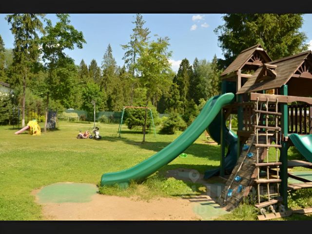 Участок с ухоженным газоном, с различными деревьями - дубы, березы, ели, туи, много сосен. Участок дренирован, оборудован системой полива, дорожками, освещен.