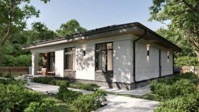 Каменный шпон фасада и лиственничная кровля придают дому оригинальный стиль. Внутри — светлые, просторные пространства в стиле скандинавского минимализма: много стекла, деревянный шпон и декоративный бетон. Потолки, выполненные из лиственницы, словно продолжают природную эстетику дома.