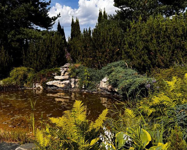 Зеленый, благоустроенный, с высокорослыми хвойными и лиственными деревьями, декоративными кустарниками и цветниками. Организованы прогулочные дорожки, освещение, автополив и дренажная система.