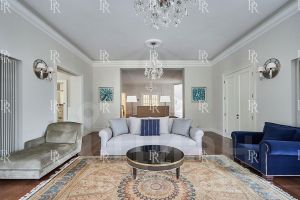 Общественная зона: Гостиная-столовая-кухня - единое пространство со вторым светом, общей площадью 106 кв. м. Выделено 5 функциональных зон: медиа зона с ТВ и дровяным камином, лаунж зона с возможностью размещения двух больших диванов, столовая, с возможностью размещения стола до 20 посадочных мест, зона бара с двумя сервантами и местом под барную стойку, парадная кухня с островом 20 кв. м. с доступом в рабочую кухню 12 кв. м. Окна этого единого пространства ориентированы сразу на три стороны юго-восток, юго-запад и северо-запад.