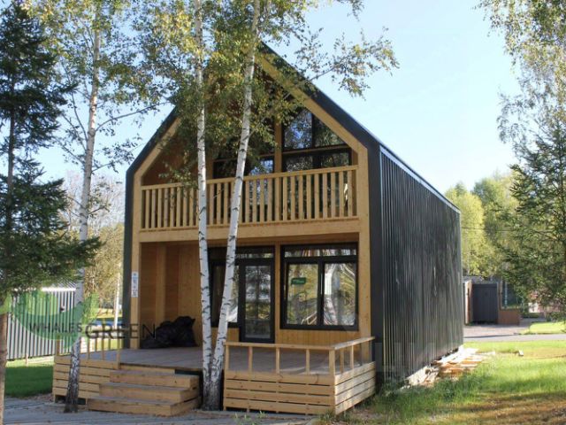 Дом построен компанией Holzbaken из клеёного бруса 365х202 на фундамента из железобетонных 4-метровых свай 200*200 мм с обвязкой клееным конструктивным брусом. Установлено панорамное остекление. Кровля кликфальц, крыша дополнительно утеплена, установлены снегозадержатели и водосточная система. В котельной установлены 2 котла: электрический и газовый, система водоочистки, вентиляционная система и система увлажнения воздуха.