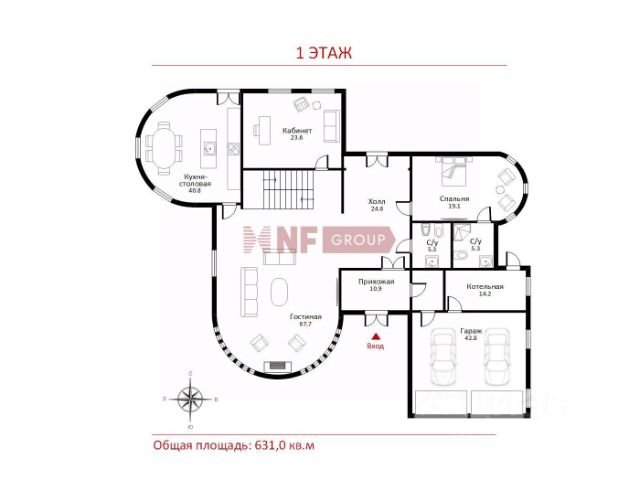 Гараж на 4 автомобиля : 2 этажа, общей площадью 374,5 м², со складской зоной и 2 квартиры для персонала. Котельная и водоподготовка расположены в отдельном помещении гаража и оборудованы двумя немецкими котлами Viessman (основным и резервным).