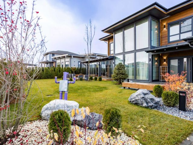 С террасы мы переходим на задний двор, продуманный для комфорта и наслаждения природой. Здесь есть функциональная и эстетическая зона с уютной площадкой для приготовления пищи и видом на декоративные растения. Более приватная зона с очагом окружена живой изгородью и перголой увитой виноградом, создавая атмосферу уединения и идеальное место для расслабляющего вечера.