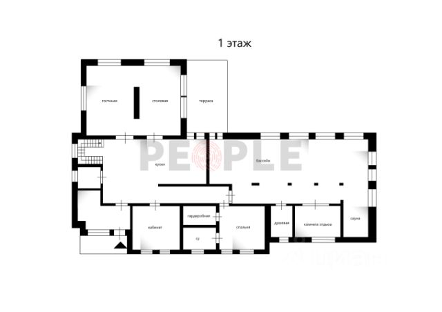 1-й этаж: холл, большая гардеробная, постирочная, кухня, столовая с выходом на открытую веранду с дровянным камином-барбекю, гостиная с паровым камином, кабинет, гостевой санузел, котельная, гостевая спальня, спа-зона 200 кв.м.: 3 душевых с обливным ведром, су, хамам с звездным небом, сауна с стеклом в бассейн, плавательный бассейн 10 на 5 м , зона отдыха с шезлонгами тв и мягкой группой мебели с выходом на террасу;