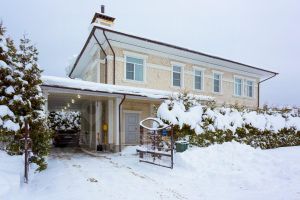 В доме: 3 спальни, гостиная с камином, кухня-столовая, крытая веранда с барбекю-зоной, кабинет, большая гардеробная для сезонных вещей на 2 этаже, постирочная, котельная, кладовая под лестницей, гараж на 1 м/м с мастерской и кладовой на втором ярусе, чердак для хранения вещей, парковка из брусчатки с навесом для 2 м/м.
