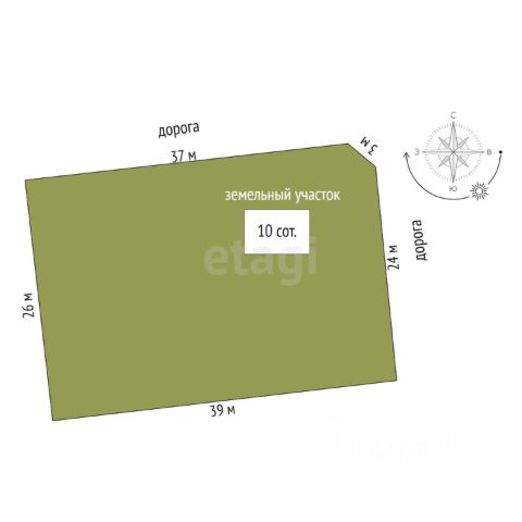 Участок 10 соток, Лпх, ровной прямоугольной формы, разбит на зону отдыха, сада, грядок с теплицей. Напротив — построек нет, поле. Заканчивается березовой рощей. Участок ухоженный, перекопан, есть плодовые растения, кусты, ягоды, грядки.
