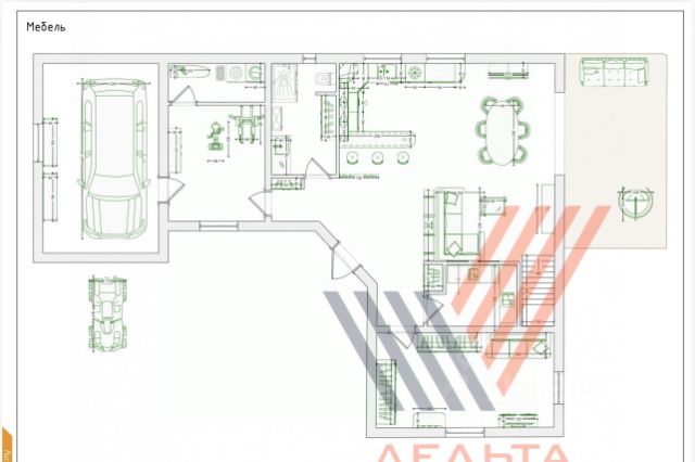 На первом этаже организованы помещения: кухня-столовая совмещена с гостинной выходящая в просторный холл и 2-е раздельные комнаты. Далее через холл раздельный санузел, отдельная кладовая и вход в гараж.