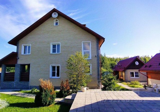 Дом построен из бруса, фундамент ленточный, обшит сайдингом, крыша металлочерепица. На первом этаже кухня-столовая, гостиная, санузел, веранда, прихожая. На втором этаже большая комната свободного назначения (~25 кв.м.) и две спальни. В дом заведена вода в круглогодичном режиме из собственного колодца, канализация автономная очистная станция Топас. Отопление дома твёрдотопливный котёл.
