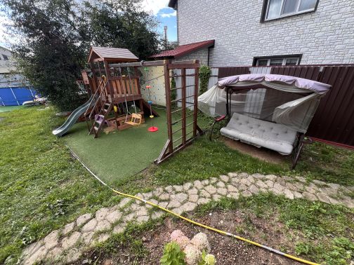Территория дома- преимущественно газон, из насаждений: цветы, туи, елки, ива кудрявая, слива (плодоносит каждый год), яблони, черешня, малина и много красивой сирени (в том числе желтая сирень, сирень сакура) и декоративные кусты, также на территории дома есть пруд глубиной 1,8 метра(с компрессором для обеспечения кислорода рыбам. В пруду жили карпы (3-5 кг), осетр, форель. Вокруг пруда красиво цветет лилия.