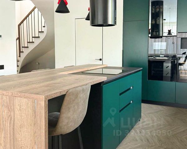 Установлена кухня с островом, столешницы выполнены из искусственного камня, бытовая техника Bosch (Германия) - холодильник, индукционная панель, посудомоечная машина, морозильник, духовка.