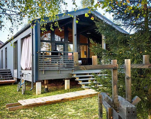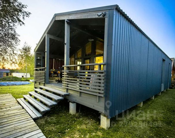 Дом построен в 2020 году по индивидуальному проекту, размеры в плане 6,5 х 12,4 м, общая площадь 75,18 м2, высота потолков от 2,3 до 3,4 м, фундамент из ж/б забивных свай, сечением 20х20 см и длиной 3 м, утепление (ТеплоKnauf Коттедж): кровля и цоколь 200 мм, стены 150 мм, перегородки 100-150 мм, пароизоляция Технониколь Премиум, ветрозащитные маты Белтермо толщиной 50 мм по внешнему контуру, фасады комбинированные, отделаны профлистом Grand Line RAL 7024 и сухой строганной древесиной хвойных пород, окрашенной Tikkurila Valtti Color Satin в два слоя, кровля из профлиста Grand Line RAL 7024 с устройством снегозадержания и водоотливной системы по одному скату, двухкамерные стеклопакеты, безрамные для панорамного остекления и в парной, в остальных комнатах ПВХ профиль, окна в пол, внутренняя отделка по стенам и выполнена из гипсокартона шпаклёванного, но не окрашенного, что дает волю для вашей фантазии и возможность выполнить чистовую отделку на свой вкус, выполнена чистовая отделка пола из шпунтованной сосновой доски толщиной 30 мм по основанию из фанеры, выполнена чистовая отделка потолков из вагонки Штиль, дом зарегистрирован. В доме есть диван, кровать, пара комодов, стеллаж, кухонные ящики в стиле Лофт, 2-х камерный холодильник, на террасе есть диван, кресла, стол, маленький холодильник.
