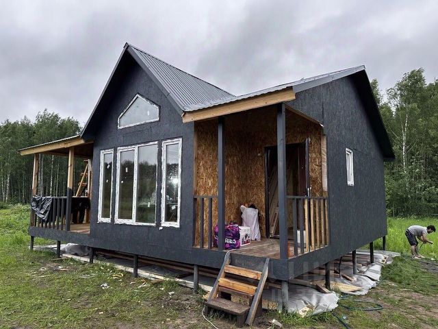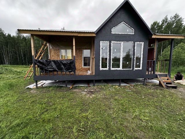 Два этажа. Спальня, гостиная, столовая с эркером и кухня на первом этаже; большая мансарда из двух комнат с балконом — на втором. Высокие потолки 3,2м, большие деревянные окна, конструкция дома - каркасный, на бетонных сваях.