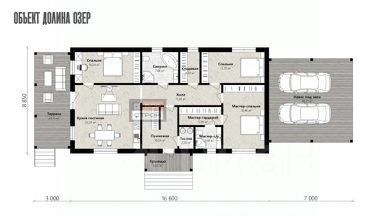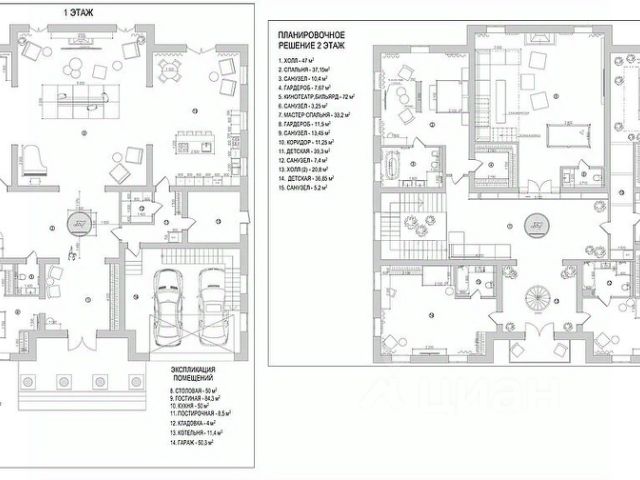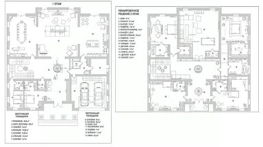 В доме кухня-гостиная 37 кв. м с выходом на террасу 30 кв. м, комната 14 кв. м с отдельным санузлом, две комнаты 15 кв. м и 15 кв. м, еще один санузел, гардеробная, постирочная, техническое помещение, холл и прихожая.