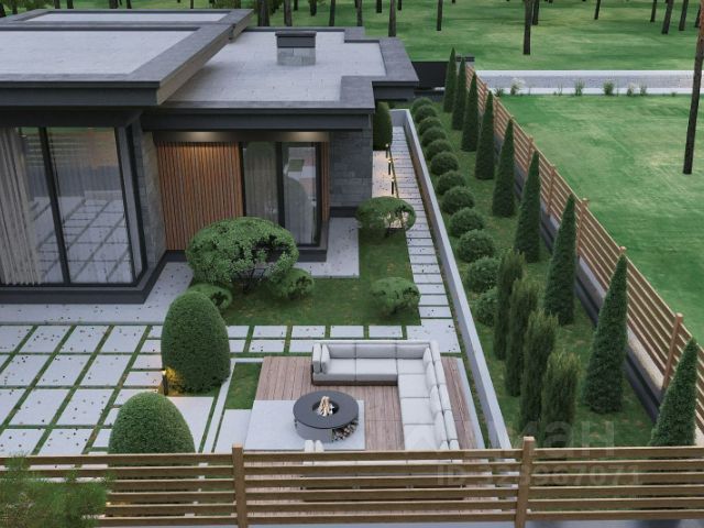 Участок 15 соток с ландшафтным дизайном и подсветкой, площадка для парковки четырех машин на бетонном основании (возможно сделать навес), тропинки, огорожен, автоматические ворота, калитка, видеонаблюдение, дренаж по участку и фундаментам, автополив.