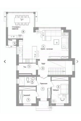 1-й этаж: тамбур (4,7 кв.м), просторный холл (37), гардеробная комната (14,3), кабинет с камином (22,1), кухня-столовая (31,8), гостиная (42,4) с выходом на веранду (31,7) и в сад. В отдельном блоке расположена вторая гостиная с панорамным остеклением (39,2), сауна (4,1), душевая (3,3), гостевой санузел (5,1), котельная (17), кладовая с холодильным и морозильным оборудованием (3,4).