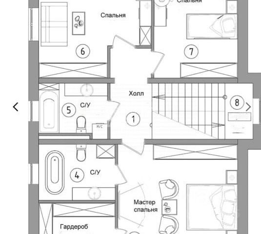 2-й этаж: 3 спальни, в каждой из которых полноценный санузел, две гардеробные, постирочная, просторный холл.