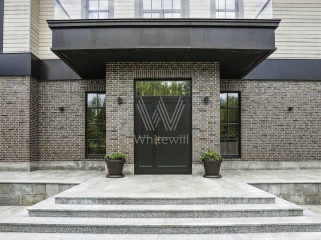 Цоколь отделан искусственным камнем. Главная лестница - входной марш, выполнена клинкерной плиткой с электрическим подогревом.