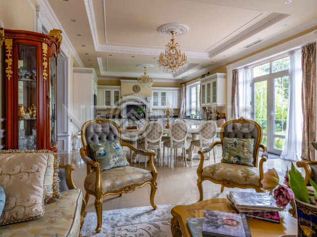 Код объекта в БД Агентства: 208-946. ВИК к/п. Премиальный меблированный дом в идеальном состоянии в престижном охраняемом коттеджном посёлке. Стены из кирпича, выразительная архитектура и отделка фасада в стиле шале: 1-ый этаж - камень, штукатурка, 2ой этаж - отделан лиственницей экстра-класса. Большие крытые террасы и лоджии. Дорогая композитная кровля с большими свесами, множество мощных деревянных балок и консолей. Деревянные стеклопакеты. В планировке - большие комнаты, есть SPA-зона, поражающий красотой камин. Внутренняя отделка "под тапочки", в современной стилистике, элитными материалами и с превосходным качеством. Мебель, сантехника, освещение от премиальных брендов. Мощная инженерия - немецкое котельное оборудование, системы бесперебойного энерго-обеспечения, видеонаблюдения, сигнализации, усиления сотовой связи и бесшовного интернета по всему участку. Роскошный и очень ухоженный участок, с парадной клумбой, вместительным паркингом, множеством взрослых деревьев, идеальным газоном; продуманный ландшафт оставляет простор и впечатляющие обзорные виды. Кроме основного есть также вспомогательный дом в стиле основного дома - с большим гаражом, гостевым блоком, и квартирой персонала.