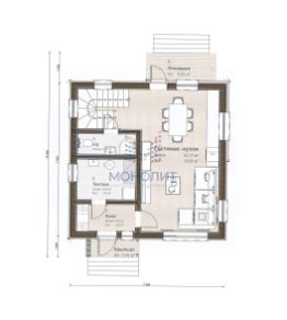 1 этаж: кухня-гостиная (24,6) с выходом на террасу (20,1), бассейн (27,6), русская баня на дровах (8,6), подсобное помещение (11,6), кладовая (8,5), тамбур (2,4), с/у (1,9).