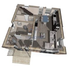 1 этаж: гостиная-столовая (56,2) с выходом на террасу (11,1), кухня (10,8) с кладовой (4), кабинет (21,2), постирочная с душем (12,1), прихожая (5,6), холл (17,2), с/у (2,4).