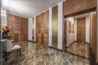 В отделке используются только премиальные материалы: мрамор (отделка камина, раковина в гостевом с/у, хаммам, прихожая, мужская мастер-ванная), кварцит (женская мастер-ванная, остров на кухне), инженерная доска из дуба (на полу), тик (потолок бассейна), кедр и абаш (сауна).