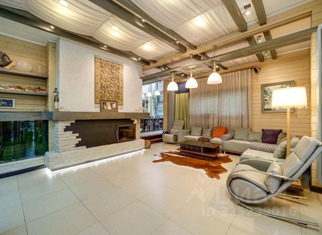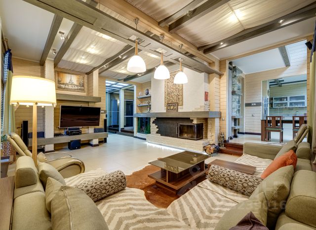 Жилой дом бревенчатый (сруб) площадью 152,1 кв. метра в два этажа, с пристройкой, террасой, баней, бильярдной с камином, мансардным этажом и навесом. На первом этаже веранда 15,2 кв. метра, огромная гостиная 30,4 кв. метра с камином, кухонной зоной 5,8 кв. метра, есть санузел с душевой кабиной, парная, душевая с купелью, комната отдыха 13,8 кв. метра, терраса 6,2 кв. метра. Второй этаж две спальни 19,6 и 13,6 кв. метра, санузел, тренажерный зал 24,8 кв. метра