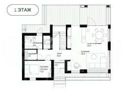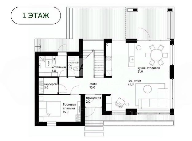 Первый этаж: гараж на два автомобиля, котельная-бойлерная с системой водоочистки, холл, две гардеробные, кухня с барной стойкой, столовая, гостиная с двусторонним камином и выходом на террасу, гостевая спальня, постирочная, санузел с душевой;