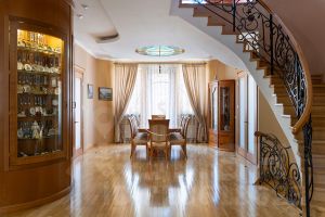 На полу в гостиной уложен художественный паркет из экзотических пород древесины, таких как дуссие, томинтоза, граб, кемпас. Также художественный паркет уложен на полах хозяйской спальни и кабинета.
