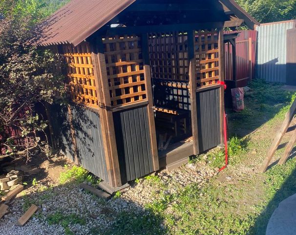 На участке имеются постройки: 4-х этажный Жилой дом из пеноблока, из которых -1 подвал под всей площадью дома (из цокольного блока-утепленный). Снаружи дом утеплен пеноплэкс 50мм (год постройки 2009 2 этаж требует косметических вложений), фундамент на основе бетонных плит, кровля изготовлена из натуральной черепицы (Италия), Окна во всем доме стеклопакеты с завода (функция - хамелеон), навес на 5-6 машин, гараж из блоков, крыша перекрытие плиты (возможно оборудовать 2 этаж под баню) имеет прямой выход на участок, оборудован металлическими стеллажами, мангал металлический кованный, качели.