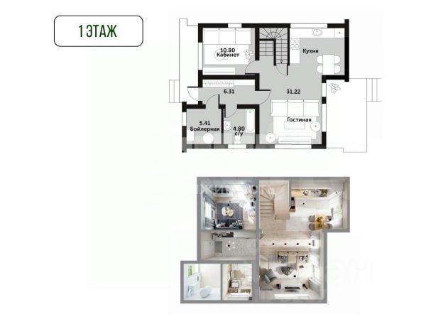 1-й этаж. "Малый дом". котельная, постирочная, комната персонала, с/у персонала, кухня персонала, гостевой с/у, кухня, цокольное помещение, винный погреб. "Большой дом". Гостевая спальня/Детская, гостевой с/у, гостиная с дровяным камином (высота 5м), центральный холл, гардероб для верхней одежды, мастер-спальня, мастер с/у. Лестница.