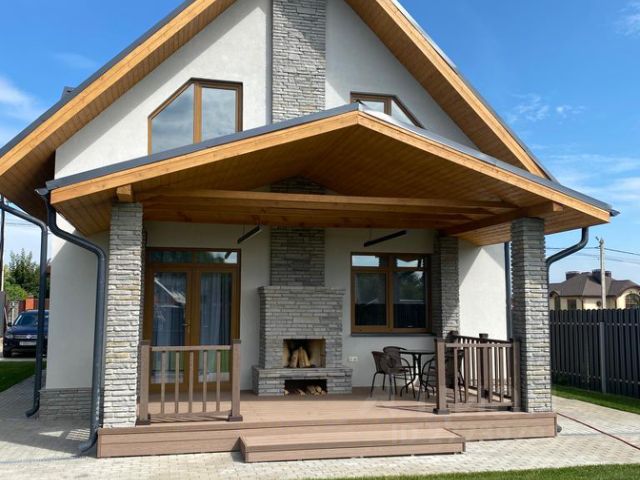 Внешняя облицовка дома комбинированная штукатурка короед, тепло панели под камень, натуральный камень.
