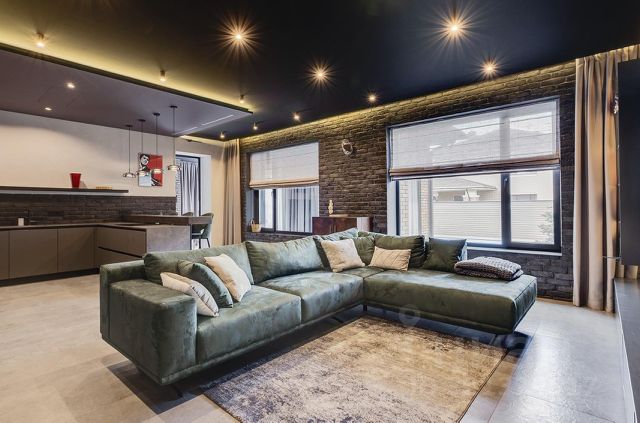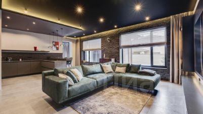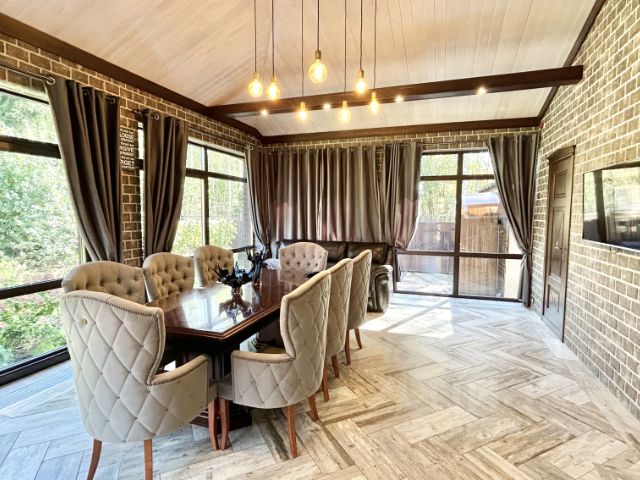 Внутри дом отделан качественными современными материалами: на полах керамогранит и паркетная доска, стены отделаны декоративным камнем, кирпичом, оклеены обоями немецкого производства, установлены дорогие межкомнатные двери. По всему первому этажу разведены теплые полы. Дом укомплектован мебелью и сантехникой.