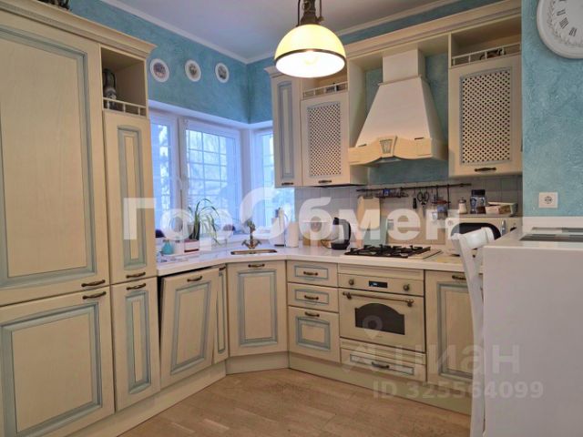 Мебель, оборудование: на кухне гарнитур с островом немецкого производства: верхние фасады из МДФ с дубовым шпоном, нижние крашеный фасады из МДФ, фурнитурой Blum; столешница из кварцевого агломерата (имитация мрамора Calaccata), фартук из клинкерной плитки Feldhaus (Германия), барная стойка из карагача. Встроенная кухонная техника; кухонный блок Restart (Италия) в ретро-стиле с шестикомфорочной газовой плитой с грилем, двумя духовками (большой и маленькой) и вытяжкой; также посудомойка NEFF, холодильник Syde-By-Syde от Restart. В столовой обеденная группа с мощным столом и стульями от фирмы "Эстетика" на 8-10 персон.