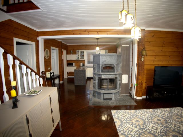 ПЛАНИРОВКА: 1 этаж - входная зона, большая кухня-гостиная (пл. 40м) с камином и выходом на просторную террасу, изолированная спальня, сан.узел с душевой кабиной, бойлерная; телый пол, керамогранит+массив лиственницы.