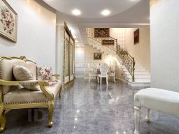 Код объекта в БД Агентства: 428-906. Полет СНТ. Меблированный дом в стиле современной классики с элегантными архитектурными решениями. В доме - сауна, бильярд, камин, просторная терраса, двухсветная гостиная. Выполнена изысканная внутренняя отделка и оформление (венецианская штукатурка, паркет, итальянская деревянная лестница из дуба), качественная инженерия. Установлен автономный дизельный генератор. Интерьер дополнен дорогостоящей мебелью. Участок - с собственным выходом в лес и эффектным ландшафтным дизайном в лесном стиле с парковыми зонами и водопадом. На участке стоит хозблок, вольер для собаки, беседка, есть зона отдыха с мангалом. Дом находится в охраняемом коттеджном посёлке с собственным прудом. Материал стен: монолит. Облицовка стен: штукатурка. Стадия готовности: меблирован. Описание внутренней отделки: выполнена стильная отделка в классическом стиле. На стенах декоративная штукатурка разных типов, в том числе венецианская. На полу спален и гостиной паркет, с зоне сауны мраморная плитка, в других помещениях керамогранит, в санузлах, зоне сауны и на кухне тёплые полы. Отделка потолков штукатурка (в санузлах подвесные и натяжные потолки). Установлены шпонированные межкомнатные двери из ценных пород дерева. На второй этаж ведёт итальянская деревянная лестница из дуба. Инженерное обеспечение: в доме дорогостоящая и высококачественная инженерия и котельное оборудование. Система отопления: газовый двухконтурный котел на 45 кВт (АCV, Бельгия). Установлена многоступенчатая система очистки воды (Ecomaster), электрика Legrand, радиаторы Kermi, стабилизаторы напряжения Штиль, домофон с видеозвонком. Вентиляция в доме естественная, в зоне сауны механическая (искусственная). Подключён дизельный генератор мощностью 16 кВт, обеспечивающий бесперебойное электроснабжение при плановых и аварийных отключениях, генератор с автоматическим переключением с ёмкостью для дизельного топлива 1 т. Мебель, оборудование: дом полностью меблирован: мебель премиум-класса в едином классическом стиле из массива дерева со вставками из мрамора Emperador Dark. Мягкая мебель и кровати из кожи. В кухне немецкий гарнитур Nolte с фасадами из МДФ и встроенная техника Miele (варочная панель, духовой шкаф, посудомоечная машина, микроволновка, пароварка, подогреватель посуды, вытяжка), холодильник Hitachi 90 см, трехзонный с парогенератором, столешница из искусственного камня. В доме дорогостоящие люстры и светильники, стильные шторы. В санузлах итальянская сантехника Migliore и Bayard-Lux. В постирочной стиральная машина Miele. Тип участка: с деревьями. Благоустройство участка: выполнен роскошный комплексный ландшафтный проект с элементами лесного и паркового дизайна. Высажены вековые деревья (ели 13 шт, голубые ели 2 шт, дуб, березы 10 шт, клены 2 шт, орешник, сирень, липы 3 шт), туи (около 40 шт), декоративные растения, кустарники, цветы. Дорожки выложены натуральным камнем, высажен газон, создано ландшафтное освещение, участок украшает альпийская горка с водопадом. Есть зона огорода на 7 грядок. Установлена система автополива Hunter с датчиками влажности, разделённая на 3 зоны. Оборудованы мангальная зона, зона отдыха с гамаком и качелями, вольер для собаки 6 кв.м, дровник, есть беседка, отдельно стоящий хозблок. По периметру участка проходит дренажная система. Дополнительные строения: хозяйственный 