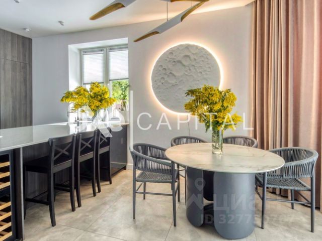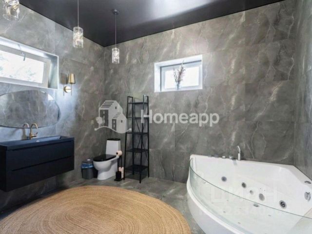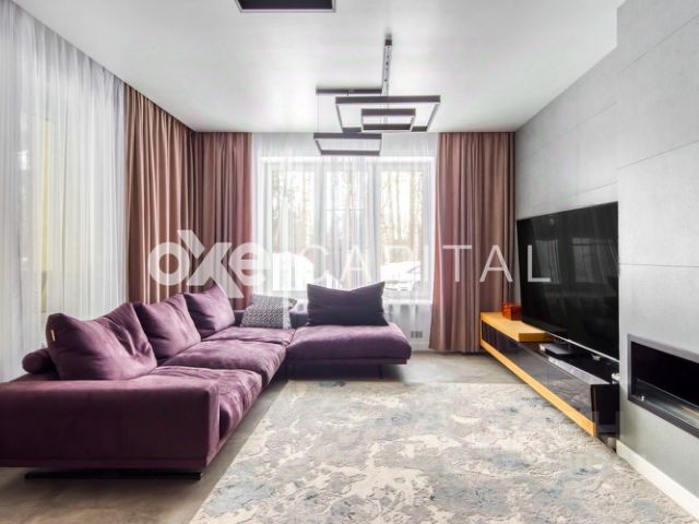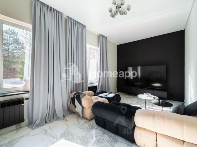 Мебель, оборудование: во всем доме элитная мебель из массива ценных пород дерева. На кухне: гарнитур Sira из шпона со встроенной техникой Electrolux (духовой шкаф, газовая плита, узкая посудомойка, микроволновая печь, морозильник), холодильник Liebherr, столовая группа на 8-10 персон. В спальнях итальянские спальные гарнитуры. Все гардеробные фирмы Mr.Doors. В постирочной - стиральная машина и сушильная машина Miele. Интерьер украшают итальянские люстры и светильники. В санузлах - итальянская сантехника, на 2-м этаже - Laufen (Швеция) со специальным покрытием.
