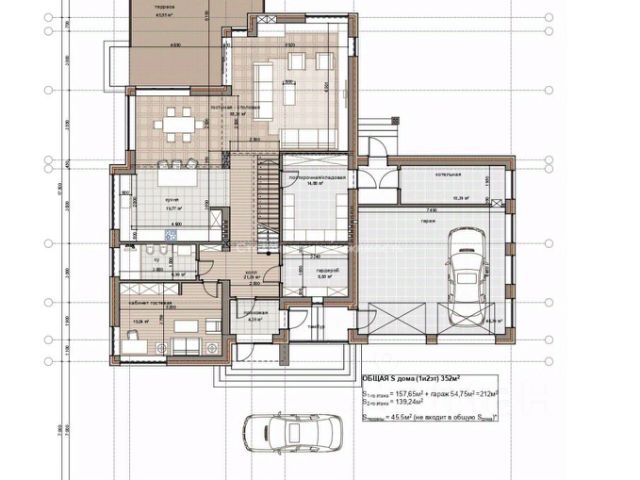 - Гараж с квартирой персонала площадью 75 кв.м, кирпичный, в стиле основного дома: 1-ый этаж: гараж на 2 авто, отапливаемый, на 2-ом этаже квартира персонала (с кухней и санузлом);