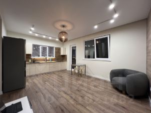 Установлена кухня с островом, столешницы выполнены из искусственного камня, бытовая техника Bosch (Германия) - холодильник, индукционная панель, посудомоечная машина, морозильник, духовка.