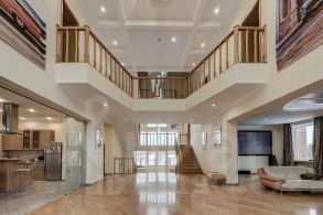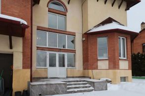 Описание внутренней отделки: выполнена стильная отделка по дизайнерскому проекту. На стенах краска (Англия), на первом этаже обои, расписанные красками, обои (Lincrusta, Англия), сланец. На полу - крупноформатный керамогранит, кварцвинил (Германия), пробковая доска (Швеция). Потолки со встроенной подсветкой и трековыми светильниками на алюминиевом профиле (Maytoni, Германия). Тёмным керамогранитом "под мрамор" облицованы камин, стены в санузлах и в холле. На второй этаж ведёт "парящая" лестница (на металлическом каркасе) с подсветкой в основании, ступенями из дуба, стеклянным ограждением. Установлены радиаторы, розетки и выключатели (Schneider Electric, Франция), межкомнатные двери скрытого монтажа из шпона дуба высотой 2,4 м ("Академия Дверей"), входная дверь и дверь на террасу с алюминиевым профилем высотой 3 м (Schco, Германия), подоконники из керамогранита. В хамаме и джакузи переливающийся свет и приглушенная музыка, прозрачная стена с видом на террасу.