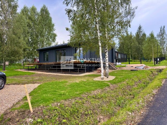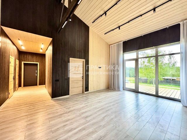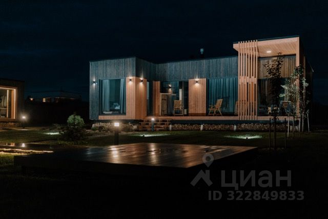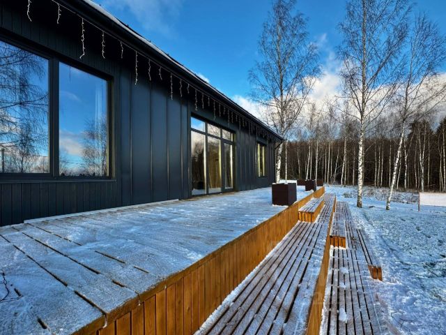 Основной одноэтажный дом площадью 120 кв.м. и высокими потолками (до 6 метров), состоит из 3х спален, 2х санузлов (один из них в мастер-спальне), кухни, совмещенной с гостиной, котельной, мансардным этажом (под кабинет), панорамными окнами. В 2х детских есть небольшой антресольный этаж для уединения с книжкой на мягком пуфе или игр.