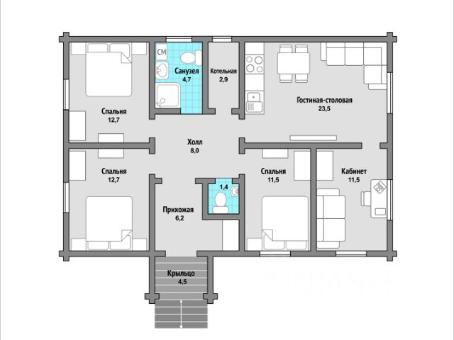 На 1-м этаже: котельная, просторная прихожая, совмещенный с/у, спальня и большая кухня-гостиная с выходом на веранду.