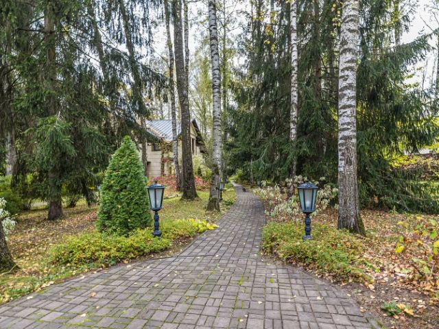 Участок 22,3 сотки с лесными (сосны, березы) и садовыми (яблони, вишни) деревьями, огорожен (фасад — кирпичный, автоматические откатные ворота).