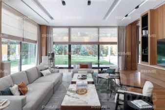 1-й этаж: На первом уровне расположены: Прихожая, гардеробная, просторная гостиная с камином, панорамным остеклением и выходом на террасу, столовая со столом на 10 персон, кухня с островом для завтраков и всем необходимым кухонным оборудованием, кабинет, гараж на 4 автомобиля.